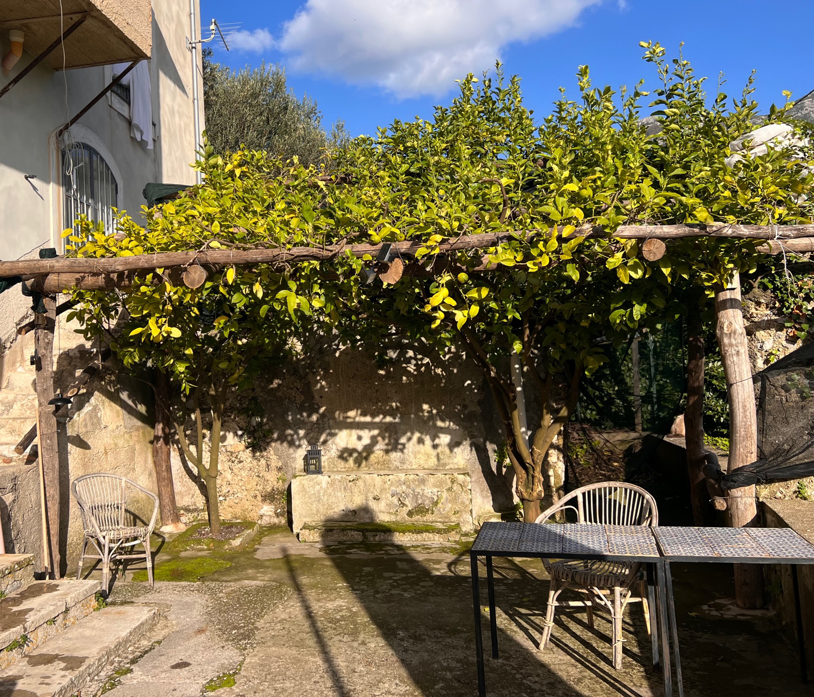 Husets 3700 kvadratmeter store have, der strækker sig over adskillige terrasser, rummer friske citroner, figner, druer, ferskener, mandler, mandariner, kastanjer og kiwi samt plads til hængekøjer i skyggen under vinrankerne.